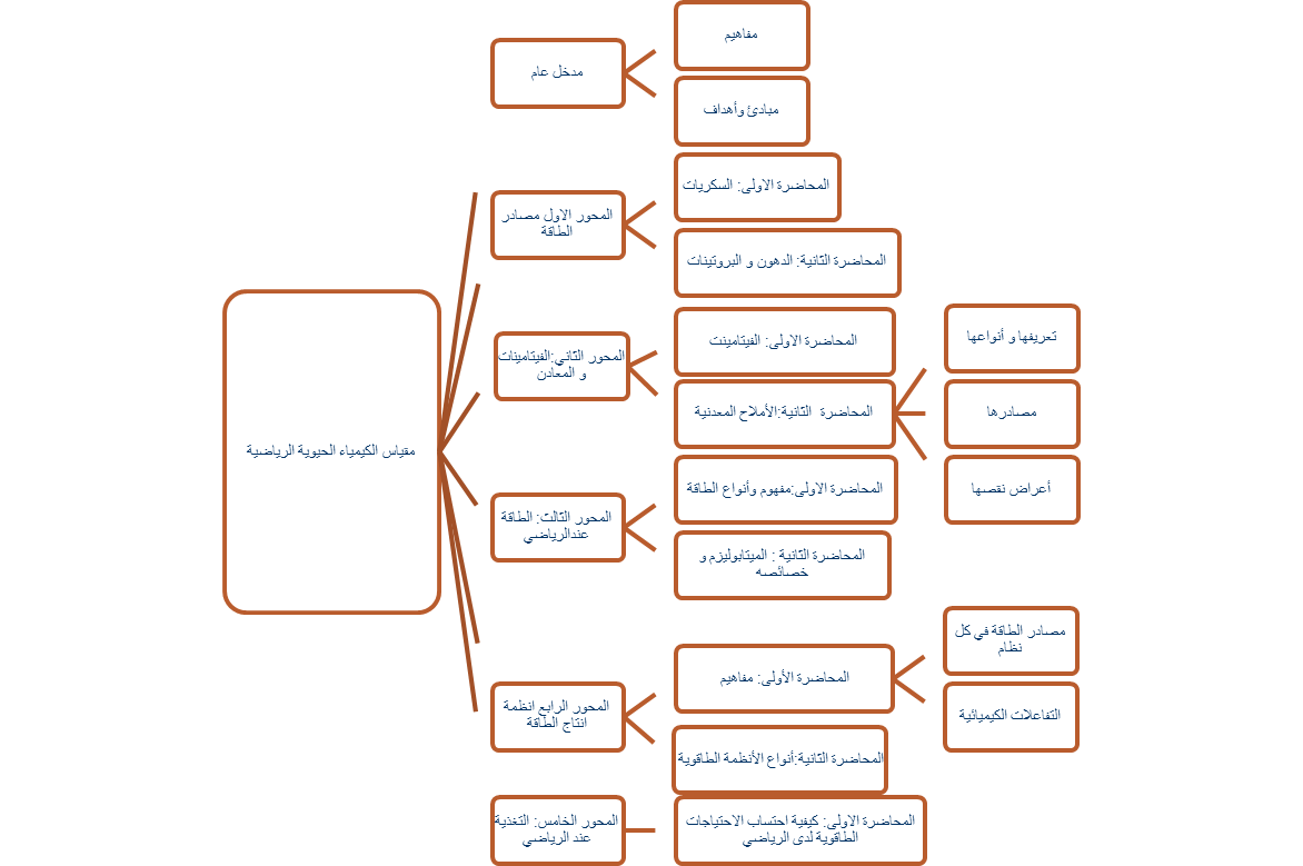 تتضمن محاضرات الكيمياء الحيوية الرياضية مجموعة من المحاور المتسلسلة تبدأ أول بتقديم مدخل عام يحدد البناء المفاهيمي للكيمياء الحيوية الرياضية ثم التطرق إلى خمس فصول أولها مكونات مصادر الطاقة ( المكونات العضوية) ثم المكونات غير العضوية ( الفيتامينات والمعادن) و ثالث فصل يتناول الطاقة و مفهومها ثم أنواع الأنظمة الطاقوية عند العضلة وأخيرا التغذية عند الرياضي.